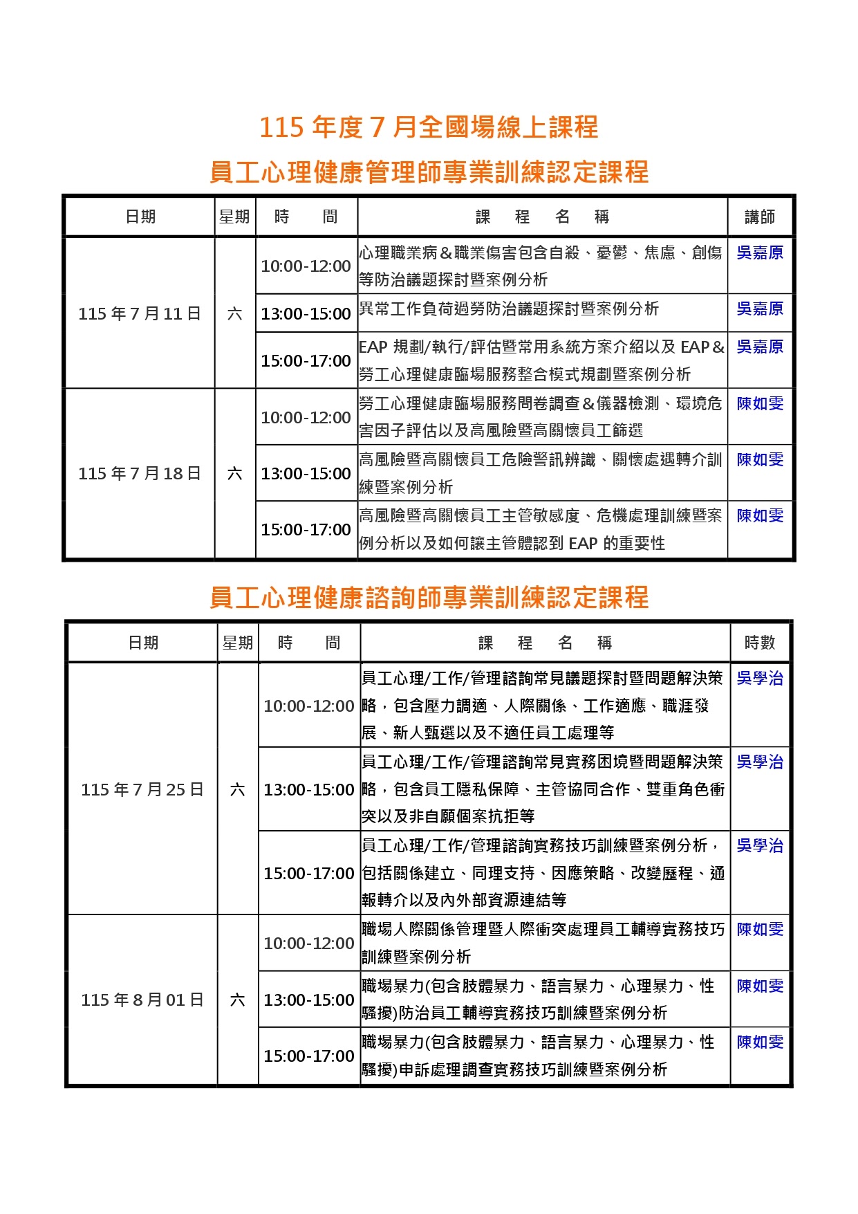 115年7月全國線上場員工心理健康管理師與諮詢師專業訓練認定課程