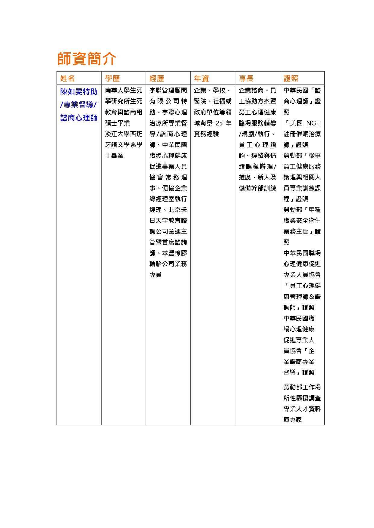 宇聯管理顧問有限公司為讓國內目前從事營利、非營利事業或公家機關員工身心健康管理諮詢、員工協助方案與勞工健康服務的實務工作者,包含人資、勞安、職安、環安、公衛、醫管、管理、醫師、護理師、臨床心理師、諮商心理師、職能治療師、物理治療師、社會工作師等以及未來對從事營利、非營利事業或公家機關員工身心健康管理諮詢、員工協助方案與勞工健康服務工作有興趣者,包含人資、勞安、職安、環安、公衛、醫管、管理、醫學、護理、臨床、諮商、心理、輔導、教育、職能、物理、社工等系所師生對於職場不法侵害防治相關議題能有更多認識瞭解,擬在「員工心理健康管理師&諮詢師專業訓練認定課程」進行職場不法侵害申訴處理調查實務技巧訓練暨案例分析基礎上繼續精進辦理「職場不法侵害防治實務技巧訓練暨案例分析進階班課程」,內容包括:(一)何謂職場不法侵害:職場暴力/職場霸凌/性騷擾/就業歧視、(二)職場不法侵害預防雇主應妥為規劃及採取必要之安全衛生措施、(三)職場不法侵害防治相關法令規範、(四)職場不法侵害申訴處理調查實務暨案例分析、(五)降低職場不法侵害最佳策略:有效溝通,歡迎全國學員踴躍報名參與!
